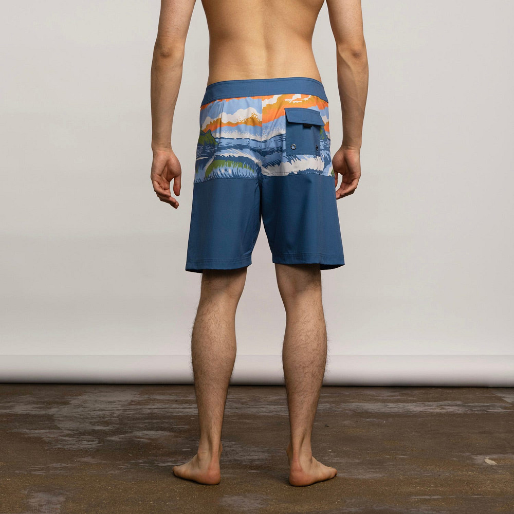 92% recycled polyester, 8% elastane, boardshort with 19" outseam, tie waist closure, panelled seam, back pocket, all over print and left leg print