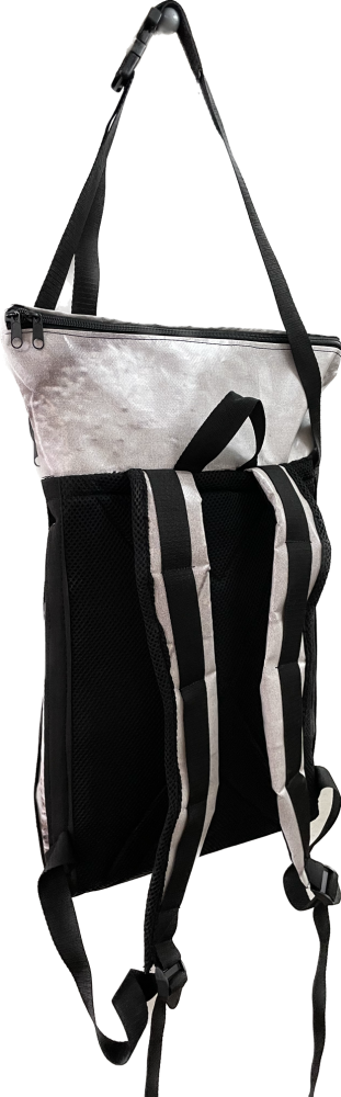Backpack is made from used advertising banner with brands motto that every material deserves a second chance.